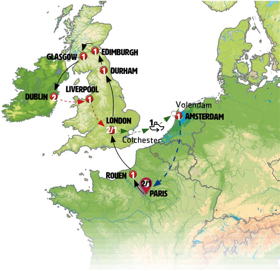 Today we’ll leave Glasgow and head towards southern Scotland to board a ferry in Cairnryan. Our journey will take us to Northern Ireland, arriving in Belfast, the capital of Northern Ireland, a monumental city that is emerging from its historical religious conflicts. We’ll then continue into Eire, Ireland, with our final stop in Dublin, arriving by the end of the day.