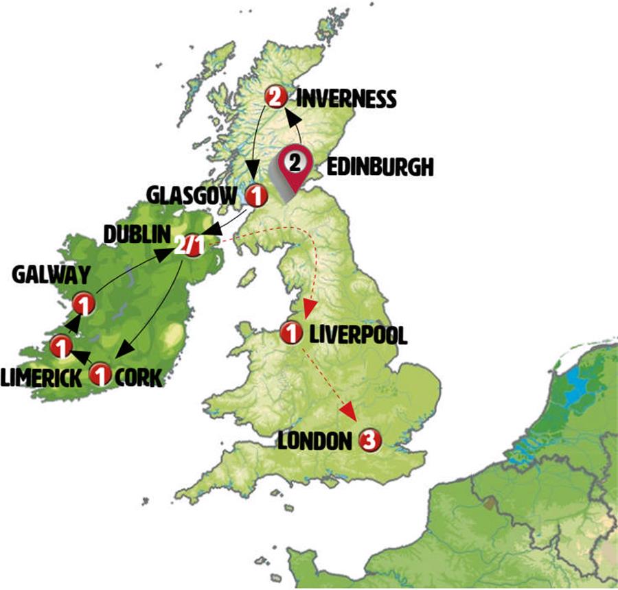 Note: Occasionally, depending on our arrival time in Dublin and the daylight hours, the tour may take place the previous afternoon.