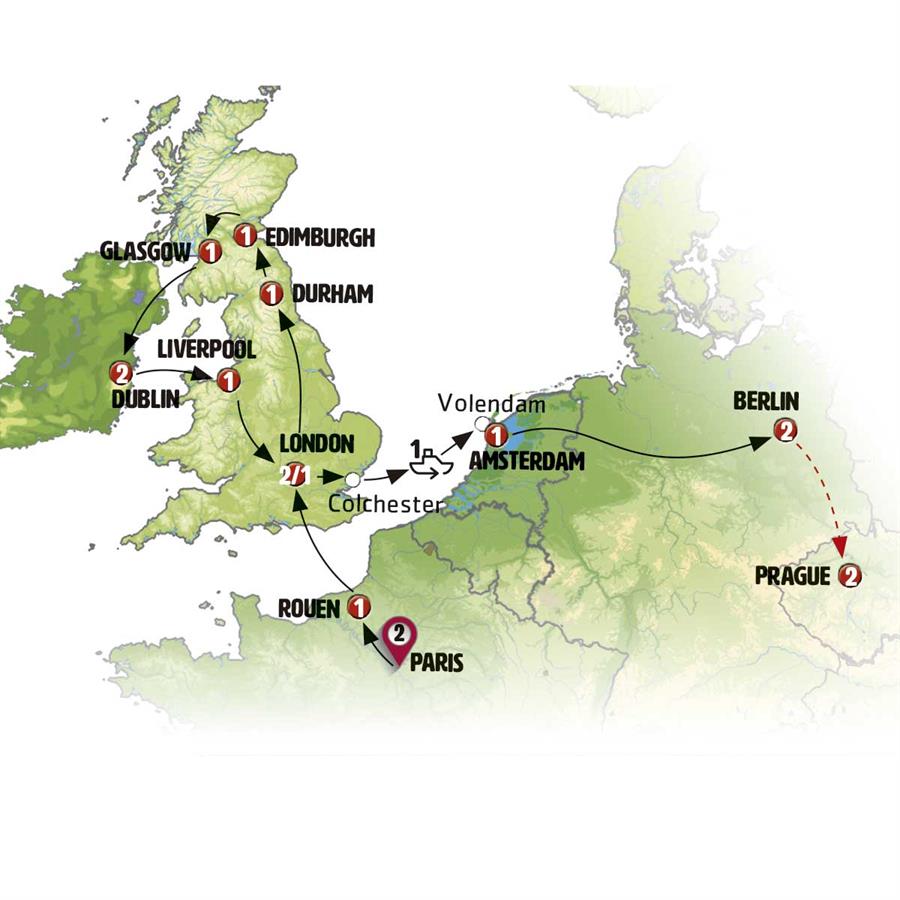 Today we’ll leave Glasgow and head towards southern Scotland to board a ferry in Cairnryan. Our journey will take us to Northern Ireland, arriving in Belfast, the capital of Northern Ireland, a monumental city that is emerging from its historical religious conflicts. We’ll then continue into Eire, Ireland, with our final stop in Dublin, arriving by the end of the day.