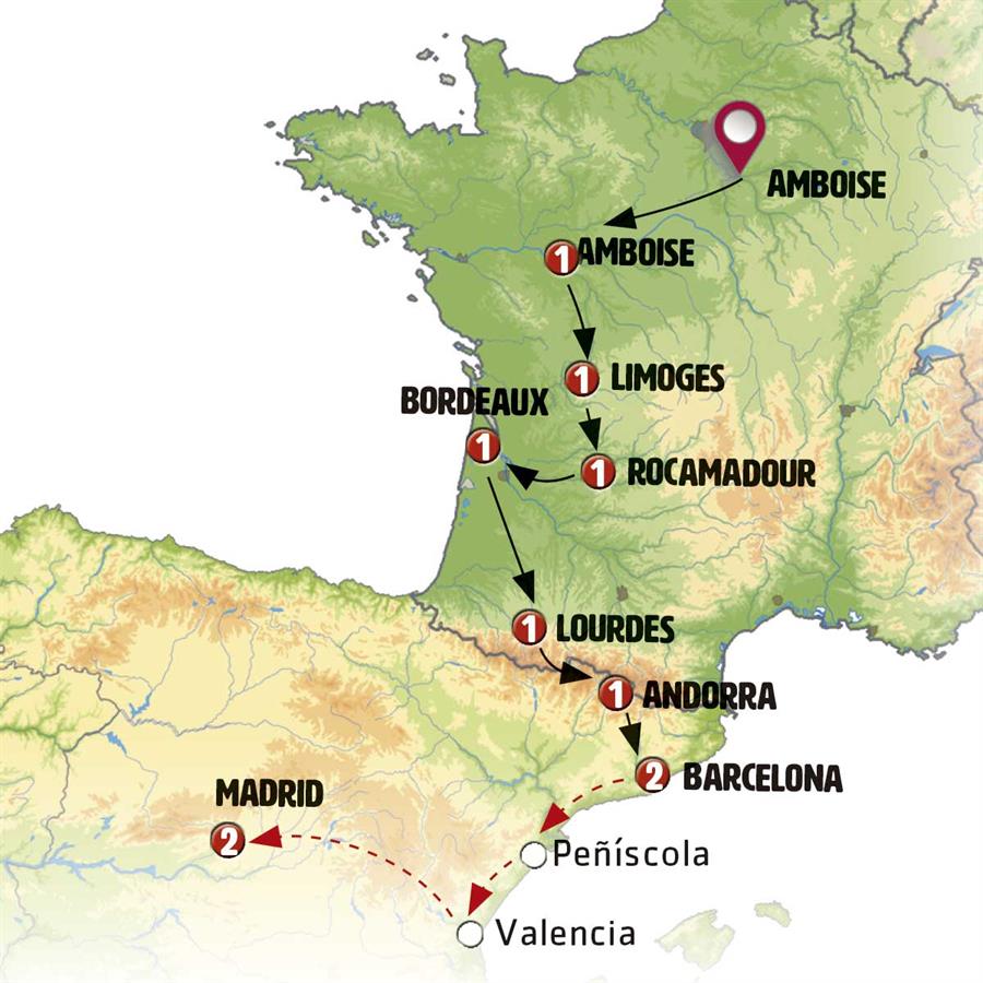 Embark on a day of discovery in the Loire Valley, starting with a morning stroll through Amboise, home to the Château du Clos Lucé, where Leonardo da Vinci spent his final three years. Delving deeper into the Loire region, we´ll explore the iconic Château de Chenonceau (tickets included), built like a bridge over the river. Next, we will visit Chambord, the largest castle in the Loire Valley (visit to the park included). Continuing our journey into central France, our next stop will be Limoges, renowned for its porcelain. We suggest visiting its historic center, where the highlight is Saint Etienne Cathedral.