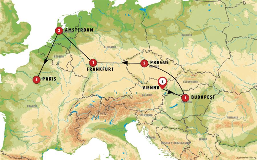 We’ll depart early from PRAGUE and stop in PILSEN, in western Bohemia, a city renowned for its beer. You’ll have time to stroll through its historic center, where you’ll find the Old Town Square, the cathedral, the Plague Column, and a Renaissance-era town hall. We’ll then cross into GERMANY and follow part of the Romantic Road. We’ll visit ROTHENBURG, a town that seems to come straight out of a fairy tale and is considered one of the most beautiful villages in the country. Afterward, we’ll head to FRANKFURT, the financial capital of Germany. After our arrival in the evening, enjoy free time in the historic city center, where you’ll find a wide variety of restaurants offering Indian, Asian, Italian, and international cuisines.