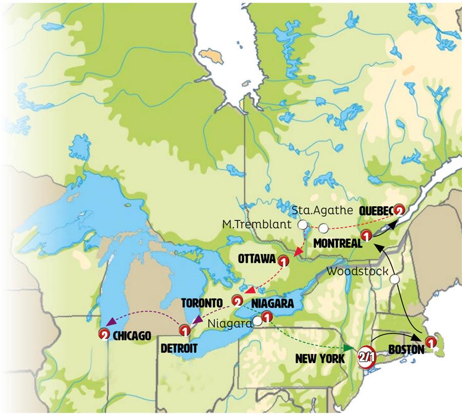 After breakfast, we cross two Eastern US states that have the most spectacular scenery: New Hampshire and Vermont, stopping at WOODSTOCK (Vermont), a beautiful town with restored Georgian houses. We cross the Canadian border and arrive at Montreal. Accommodation.