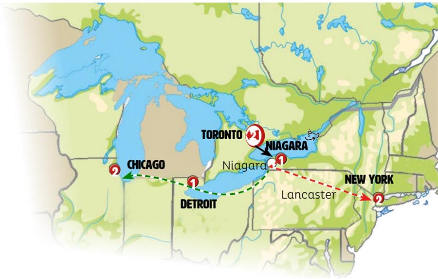 After breakfast, we will go to the beautiful town of NIAGARA ON THE LAKE. After strolling around for some time, we will continue to Niagara Falls. Once there, we will take photos of the Floral Clock before we get on the Hornblower Niagara Cruise, a small boat that will take us to the foot of the famous falls. We will later have some free time to enjoy the Clifton Hill attractions. In the late afternoon we will arrive to our hotel in Niagara Falls.