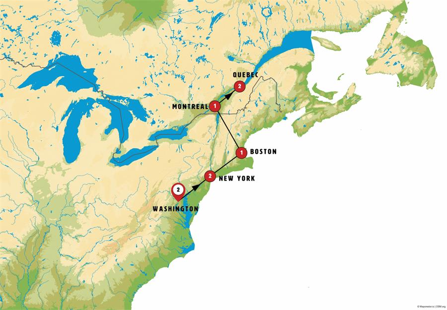 After breakfast, we cross two Eastern US states that have the most spectacular scenery: New Hampshire and Vermont, stopping at WOODSTOCK (Vermont), a beautiful town with restored Georgian houses. We cross the Canadian border and arrive at Montreal. Accommodation.