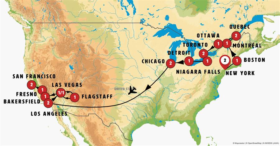 After breakfast, we will go to the beautiful town of NIAGARA ON THE LAKE. After strolling around for some time, we will continue to Niagara Falls. Once there, we will take photos of the Floral Clock before we get on the Hornblower Niagara Cruise, a small boat that will take us to the foot of the famous falls. We will later have some free time to enjoy the Clifton Hill attractions. In the late afternoon we will arrive to our hotel in Niagara Falls.