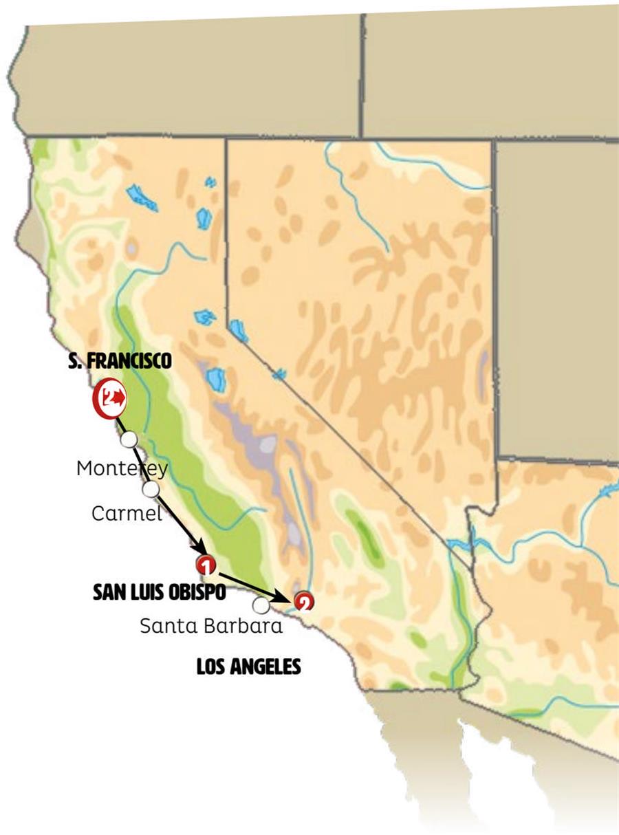 TODAY’S HIGHLIGHTS: Monterey’s jetty. Carmel, and elegant tourist resort. After breakfast we leave for Monterey, with time to walk along Cannery Row, with its old canning factories, now converted into restaurants and leisure venues. After spending some free time in the city, we set out for Carmel, an attractive tourist resort where we can visit its elegant shops and art galleries. Then we continue our journey to San Luis Obispo, a pleasant town to overnight.