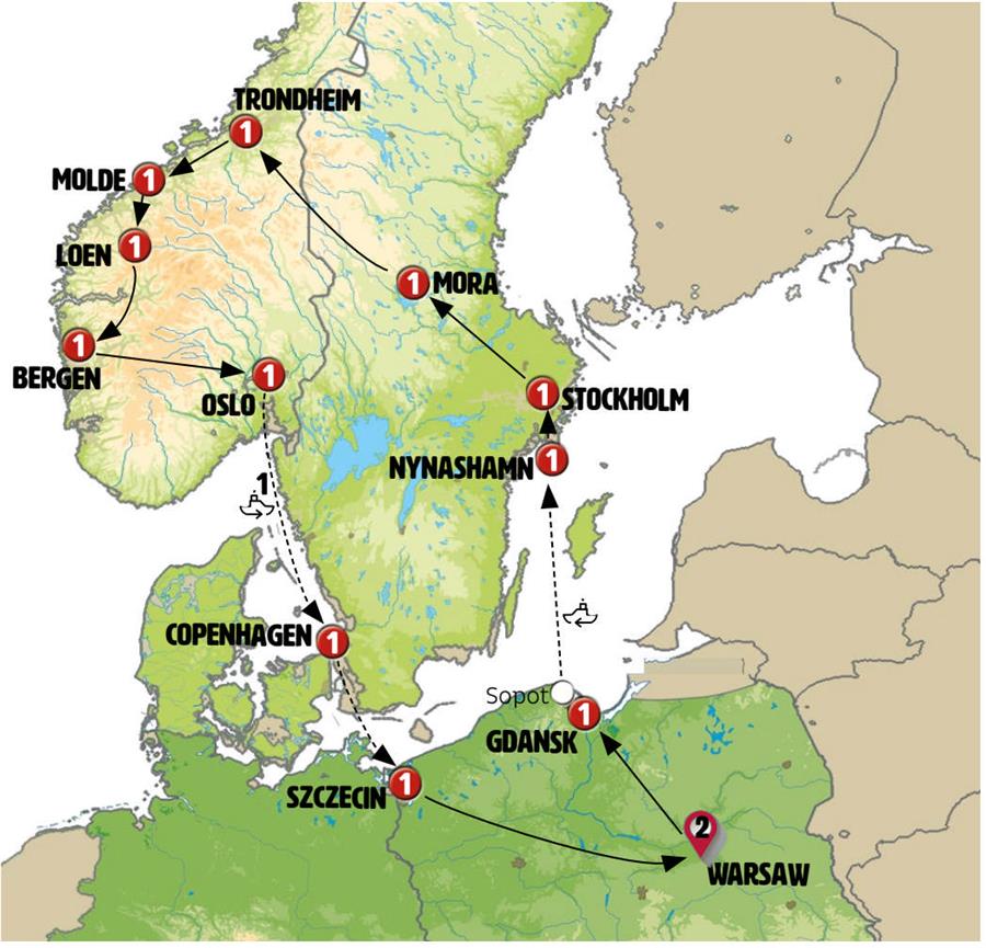 After breakfast, we’ll join our guide for a visit to the European Solidarity Centre, a striking contemporary building that commemorates the history of the Solidarity movement, which played a pivotal role in the fall of the Soviet Union. Highlights include the monument dedicated to the fallen workers. Next, we’ll include admission to the Museum of the Second World War. This impressive museum, opened in 2017, serves as a powerful reminder of the 3 to 6 million people who lost their lives in POLAND during that tragic conflict. Afterward, we’ll have some time to explore the historic center before heading to SOPOT, a charming seaside resort on the Baltic Sea. Known for its vibrant atmosphere, Sopot features a long sandy beach and one of Europe’s longest wooden piers, offering stunning views of the sea. In the evening, we’ll board a modern ferry (cruise-style) for our journey to SWEDEN. The scheduled departure is at 07:30 p.m., with overnight accommodations in cabins. Breakfast will be included.