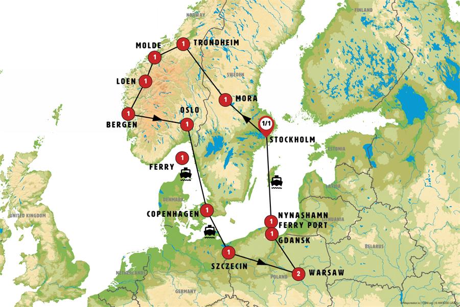 After breakfast, we’ll head to GEDSER, a quaint town that marks the southernmost point of Scandinavia. Around 11:00 a.m., we’ll board a modern ferry to GERMANY for a two-hour crossing of the Baltic Sea. We recommend you have lunch on the ship. We’ll arrive in ROSTOCK, where you’ll have time to explore this lively city, with the largest German port on the Baltic. Its vibrant old town features landmarks such as the Market Square, the City Hall, and St. Mary’s Church. Continuing our journey, we’ll travel through the Pomerania region into POLAND. We’ll arrive in SZCZECIN in the evening, a historic university city on the banks of the Oder River. The city’s charming historic center is home to the Pomeranian Dukes’ Castle and scenic riverside terraces. You’ll have free time to stroll around and soak in the atmosphere.
