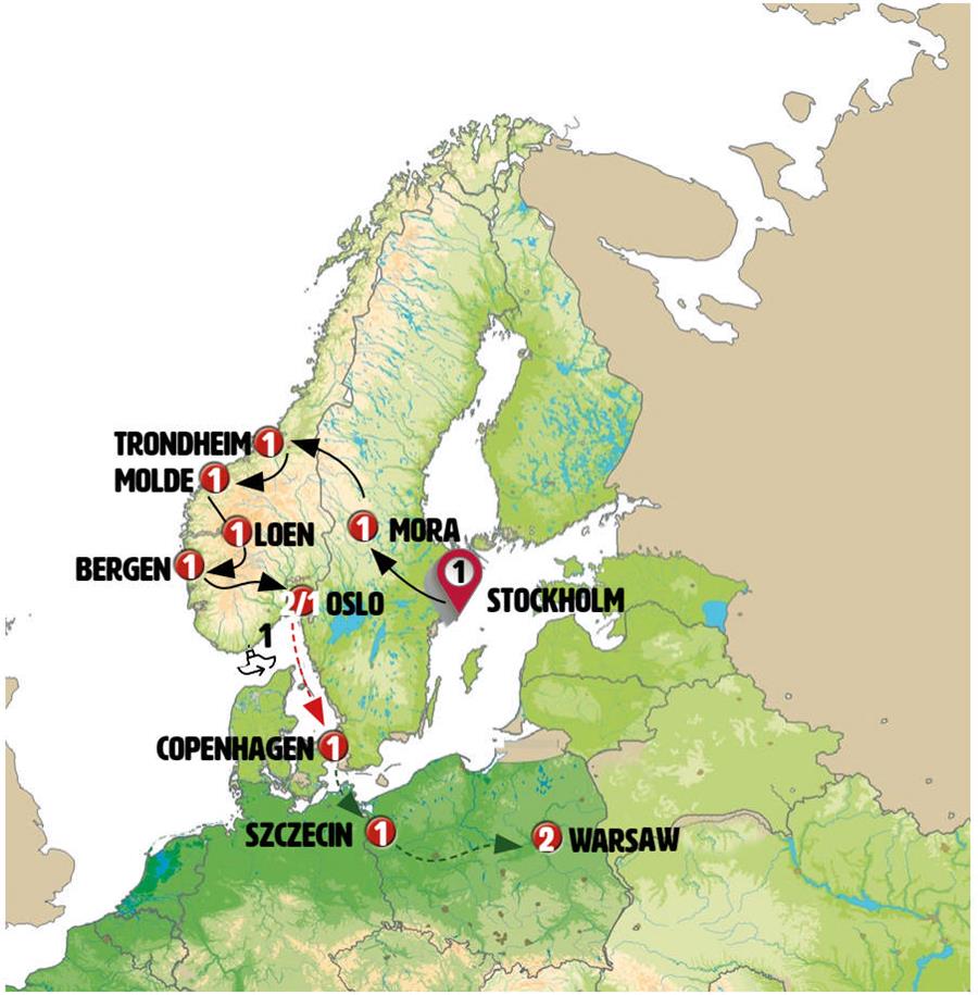 We’ll depart early for NORWAY, traveling through vast forests, lakes, and mountains. Our first stop will be FUNÄSDALEN, a popular ski resort. From there, we’ll continue to RØROS, where we’ll have time for lunch and to explore this historic mining town, a World Heritage Site and one of the most picturesque towns in Norway. Highlights include its charming historic center, the old miners´ houses, and a museum dedicated to the town’s old foundry. Our journey will then take us to TRONDHEIM, located in the central coastal region of Norway. As the third largest city in the country, Trondheim boasts a rich history dating back to the Viking era and served as the capital of Norway during the Middle Ages. Highlights include its 11th-century cathedral and the iconic old bridge over the canal. You’ll also have the chance to enjoy Trondheim’s vibrant nightlife and its wide selection of restaurants.