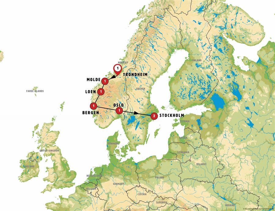 After some time exploring the heart of TRONDHEIM, we’ll continue our journey. Today, we’ll take in stunning views of the coastline and fjords along the Norwegian Sea. We’ll cross one of these fjords by ferry before arriving in KRISTIANSUND, a city celebrated for its beautiful natural surroundings. Traditionally a fishing hub, Kristiansund is spread across several islands connected by bridges and embankments, giving the city its unique character. The charming city center features cobblestone streets, shops, restaurants and cafes. We’ll have time to stroll around and enjoy lunch here. Later, we’ll travel through scenic landscapes to visit the Kvernes Stave Church (admission included), a 14th-century treasure that houses an incredible 300-year-old ship model and altarpieces dedicated to the Virgin Mary. Our route will then take us along the famous Atlantic Road, often considered the most beautiful stretch of road by the ocean in NORWAY. This spectacular drive crosses eight bridges that connect various islands. At times, the ocean’s swell crashes against the coast, heightening the dramatic beauty of the scenery. We’ll stop at one of the viewpoints to soak in the views before continuing to MOLDE, where we’ll arrive by evening. This vibrant town, nestled along its fjord, is a regular docking point for cruise ships.