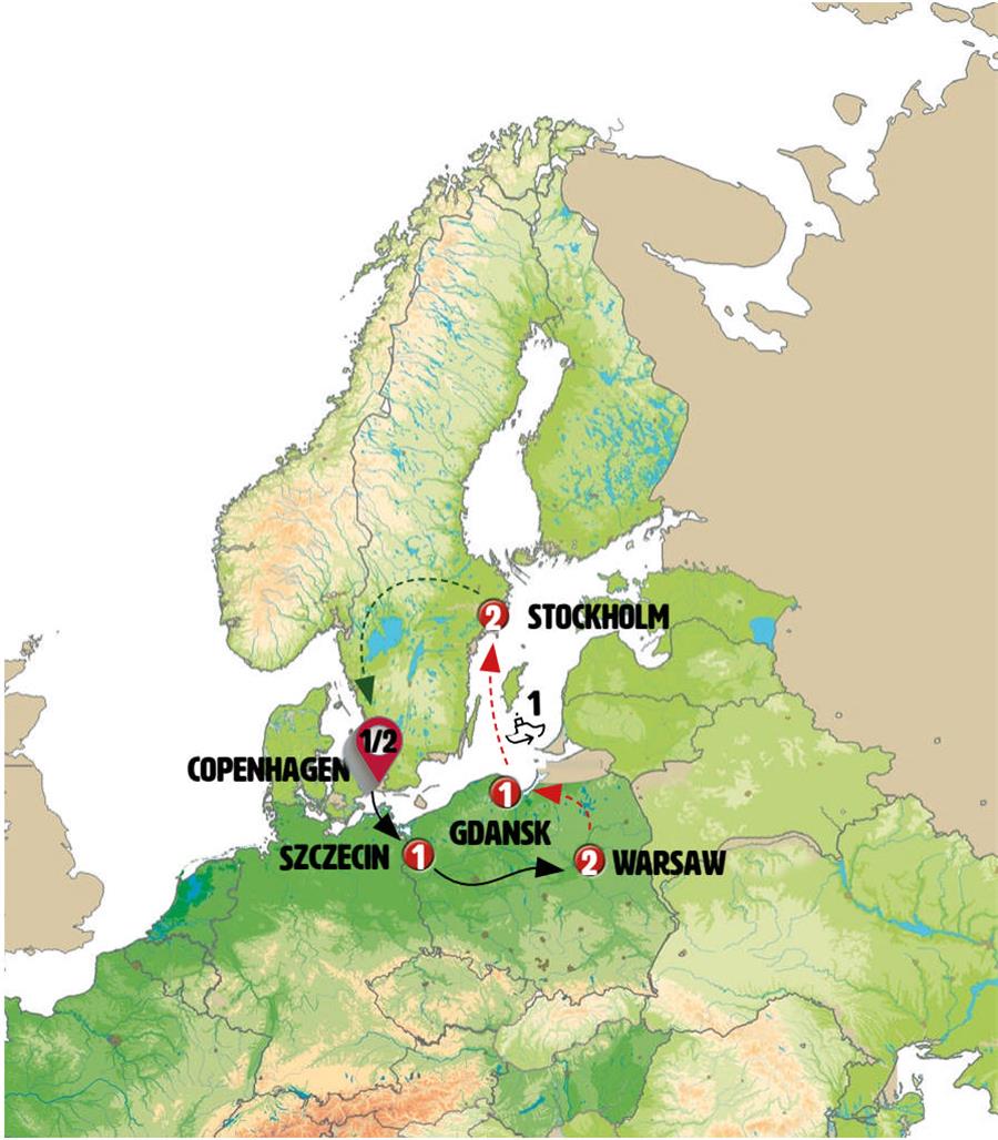 After breakfast, we’ll head to GEDSER, a quaint town that marks the southernmost point of Scandinavia. Around 11:00 a.m., we’ll board a modern ferry to GERMANY for a two-hour crossing of the Baltic Sea. We recommend you have lunch on the ship. We’ll arrive in ROSTOCK, where you’ll have time to explore this lively city, with the largest German port on the Baltic. Its vibrant old town features landmarks such as the Market Square, the City Hall, and St. Mary’s Church. Continuing our journey, we’ll travel through the Pomerania region into POLAND. We’ll arrive in SZCZECIN in the evening, a historic university city on the banks of the Oder River. The city’s charming historic center is home to the Pomeranian Dukes’ Castle and scenic riverside terraces. You’ll have free time to stroll around and soak in the atmosphere.
