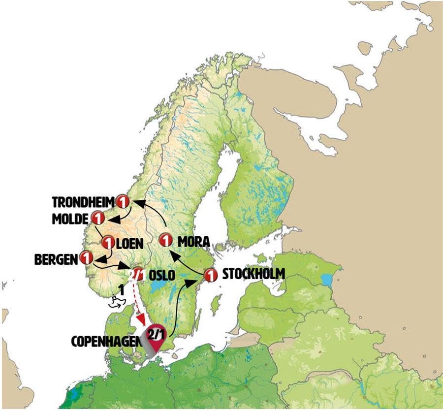 We’ll depart early for NORWAY, traveling through vast forests, lakes, and mountains. Our first stop will be FUNÄSDALEN, a popular ski resort. From there, we’ll continue to RØROS, where we’ll have time for lunch and to explore this historic mining town, a World Heritage Site and one of the most picturesque towns in Norway. Highlights include its charming historic center, the old miners´ houses, and a museum dedicated to the town’s old foundry. Our journey will then take us to TRONDHEIM, located in the central coastal region of Norway. As the third largest city in the country, Trondheim boasts a rich history dating back to the Viking era and served as the capital of Norway during the Middle Ages. Highlights include its 11th-century cathedral and the iconic old bridge over the canal. You’ll also have the chance to enjoy Trondheim’s vibrant nightlife and its wide selection of restaurants.