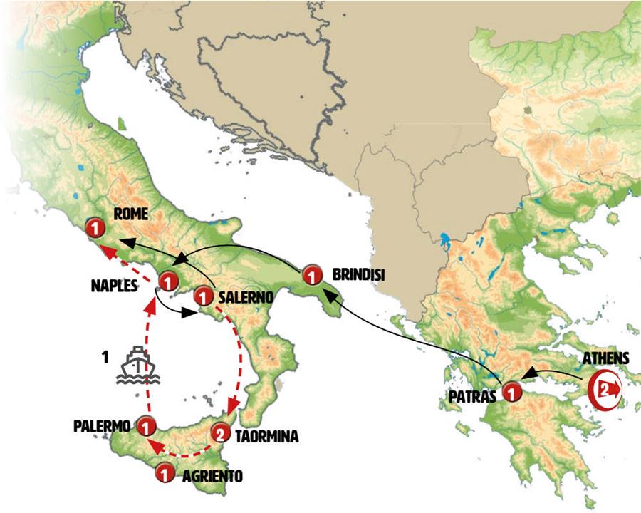After breakfast, we’ll cross the Rio–Antirrio Bridge, a spectacular suspension bridge that connects the Peloponnese with the Greek mainland. We’ll travel through the regions of Central Greece and Epirus. Upon arrival in Igoumenitsa, a port town, there will be time for a stroll before boarding the modern ferry at 02:00 p.m. to sail across the Ionian Sea to Italy. We’ll reach Brindisi by the end of the day, around 09:00 p.m., where we’ll spend the night.