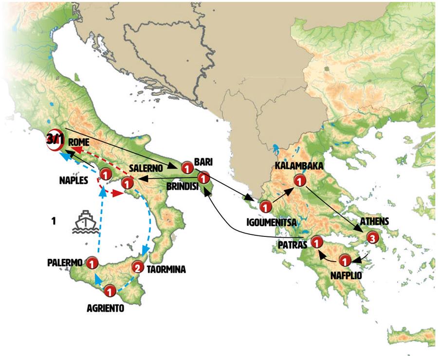 After breakfast, we’ll continue to Brindisi, where you can go on a nice walk along the sea, see the impressive Roman column and explore the old town. Later, we’ll board a modern ferry (scheduled departure at 1:00 p.m.) for our journey across the Ionian Sea. We’ll arrive in Igoumenitsa, Greece, after an 8-hour journey and head to our accommodation.