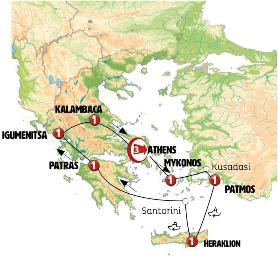 After breakfast, we’ll transfer you to the Lavrio Port for an 11:00 a.m. departure. Enjoy the scenic sea views as we sail.