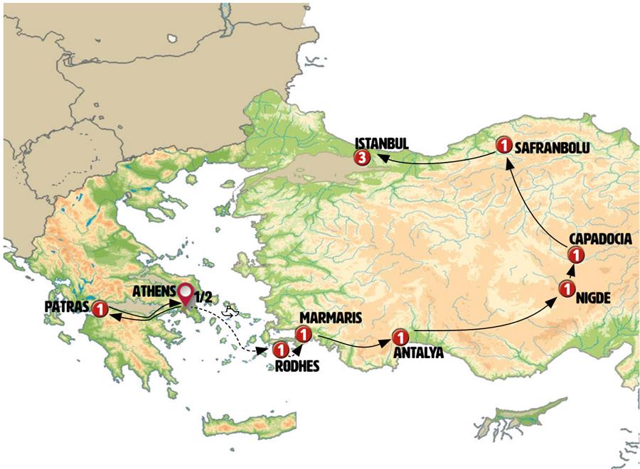 IMPORTANT: The ferry schedule between Rhodes and Marmaris is frequently subject to change and may not operate daily (except during the summer months). As a result, this part of the itinerary may need to be adjusted accordingly.