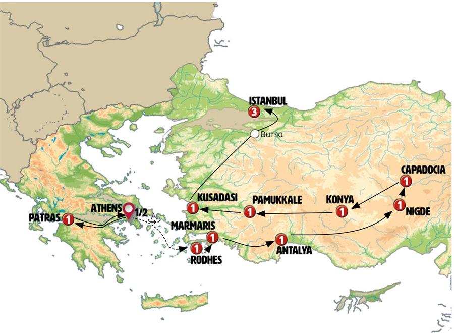 IMPORTANT: The ferry schedule between Rhodes and Marmaris is frequently subject to change and may not operate daily (except during the summer months). As a result, this part of the itinerary may need to be adjusted accordingly.