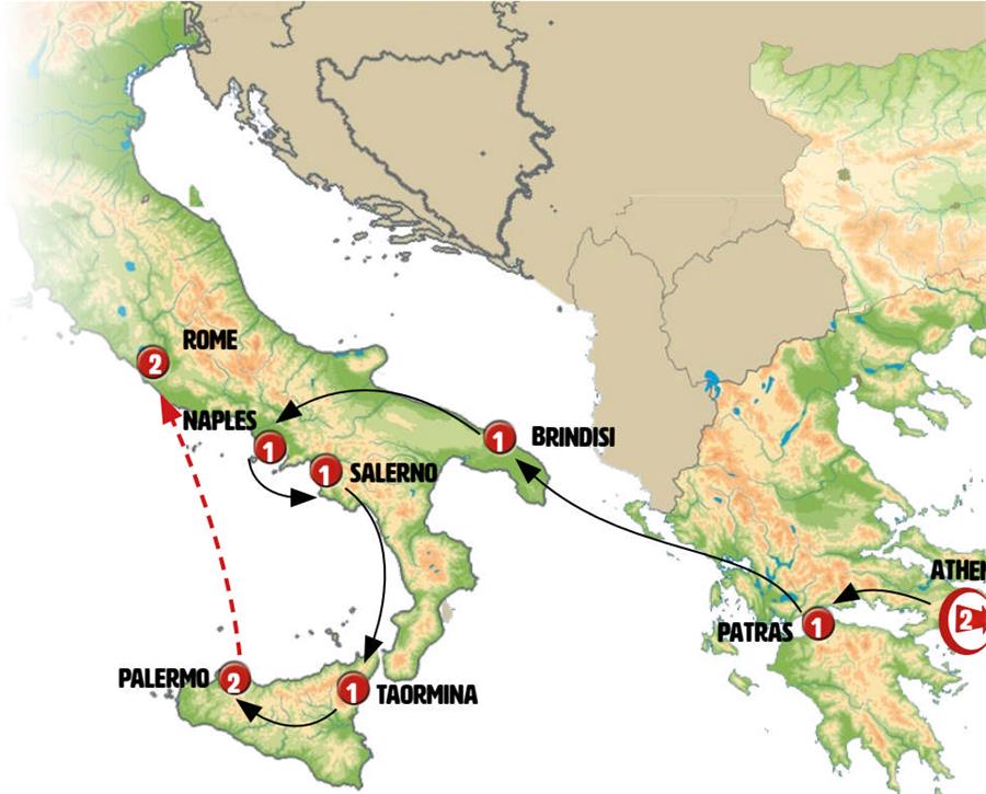 After breakfast, we’ll cross the Rio–Antirrio Bridge, a spectacular suspension bridge that connects the Peloponnese with the Greek mainland. We’ll travel through the regions of Central Greece and Epirus. Upon arrival in Igoumenitsa, a port town, there will be time for a stroll before boarding the modern ferry at 02:00 p.m. to sail across the Ionian Sea to Italy. We’ll reach Brindisi by the end of the day, around 09:00 p.m., where we’ll spend the night.