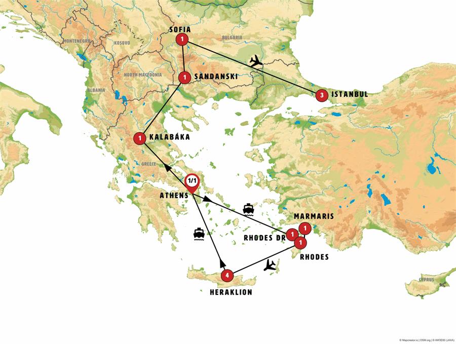 IMPORTANT: The ferry schedule between Rhodes and Marmaris is frequently subject to change and may not operate daily (except during the summer months). As a result, this part of the itinerary may need to be adjusted accordingly.
