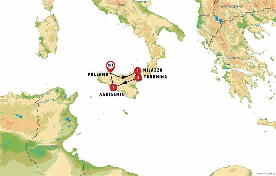 Note: During the summer or on special dates, accommodation may be arranged in Messina instead of Taormina.