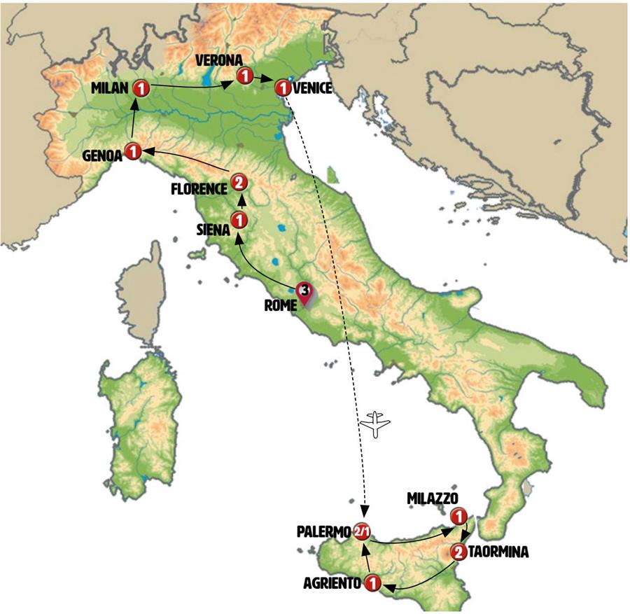 Note: During the summer or on special dates, accommodation may be arranged in Messina instead of Taormina.