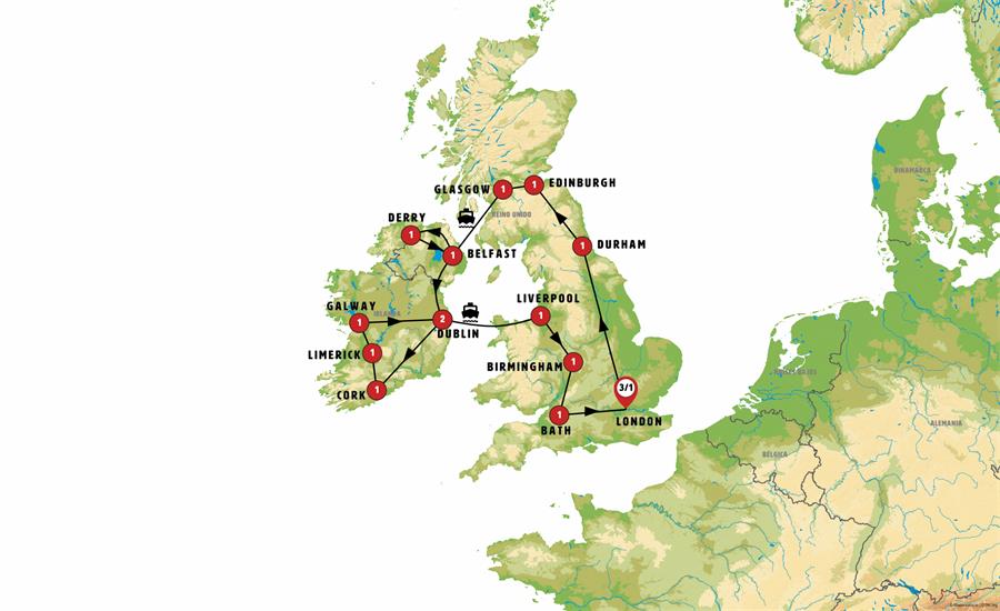 After breakfast, we’ll depart and pass through the village of CUSHENDUN (tickets included), a conservation area since 1980, recognized for its architectural significance and its stunning location along the Antrim Coast and Glens, an Area of Outstanding Natural Beauty. Around noon, we’ll stop for lunch in BALLYCASTLE, a lively seaside village known for its great food and rich folklore. After lunch (not included), we’ll visit the stunning Giant´s Causeway (admission included), a remarkable site of basalt columns sticking out of the Atlantic Ocean, inspired by the legend of an Irish giant who built the path after being challenged to a fight by a Scottish giant. The site features 40,000 hexagonal stones, nearly 60 million years old, formed by the cooling of volcanic eruptions. You’ll have time to explore—comfortable shoes and warm clothes are recommended. In BUSHMILLS, we visit the world’s oldest licensed whiskey distillery (entry and guided tour in English included) We’ll then arrive in DERRY, a historic walled city that blends tradition with modernity. Free time for a walk before checking into your accommodation.