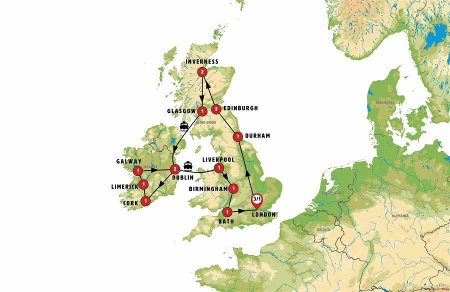 Today we’ll leave Glasgow and head towards southern Scotland to board a ferry in Cairnryan. Our journey will take us to Northern Ireland, arriving in Belfast, the capital of Northern Ireland, a monumental city that is emerging from its historical religious conflicts. We’ll then continue into Eire, Ireland, with our final stop in Dublin, arriving by the end of the day.