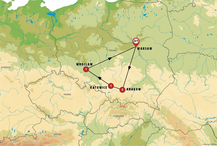 We’ll travel to the region of Greater Poland and reach its capital, Poznan, one of the oldest cities in the country. Its old town features the impressive Market Square, where the Town Hall is surrounded by colorful Renaissance buildings, creating a cheerful and inviting atmosphere. At noon, in this square, you’ll witness the charming 16th-century tradition of two mechanical goats butting heads at the sound of the clock. You’ll have time for lunch and a stroll. We’ll then continue to Toruń, a Gothic walled city with a magnificent historic center, declared a UNESCO World Heritage Site, and the birthplace of Copernicus. If you wish, you can visit his museum/home. Afterward, we’ll travel to Warsaw, the capital of Poland, arriving at the end of the day.