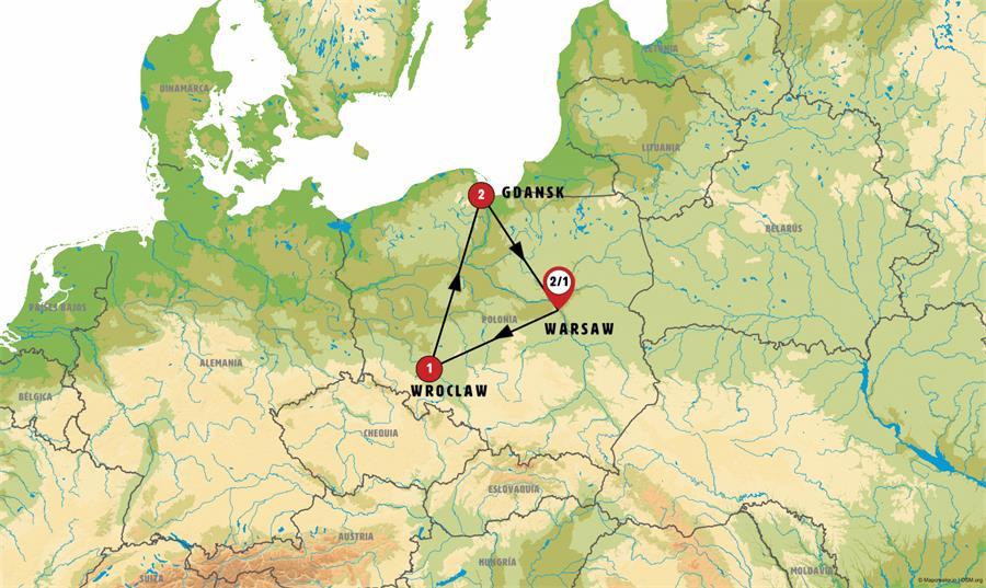 We’ll travel to the region of Greater Poland and reach its capital, Poznan, one of the oldest cities in the country. Its old town features the impressive Market Square, where the Town Hall is surrounded by colorful Renaissance buildings, creating a cheerful and inviting atmosphere. At noon, in this square, you’ll witness the charming 16th-century tradition of two mechanical goats butting heads at the sound of the clock. You’ll have time for lunch and a stroll. We’ll then continue to Toruń, a Gothic walled city with a magnificent historic center, declared a UNESCO World Heritage Site, and the birthplace of Copernicus. If you wish, you can visit his museum/home. Afterward, we’ll travel to Gdansk, formerly Danzig, arriving in the late afternoon. Its historic center is charming and full of life. We highly recommend taking an evening stroll to soak in the vibrant atmosphere.