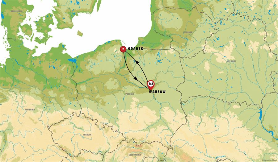 We’ll depart toward the west of Poland, arriving in Lodz, the third largest city in the country. Once a major industrial center, it declined after the war and the socialist period. We’ll visit the museum dedicated to the Jewish ghetto (tickets included), the second largest during World War II, along with its small train station (tickets included). Afterward, you’ll have time for lunch and a stroll in Manufaktura, a vast shopping and recreational complex repurposed from a former textile factory. We’ll then continue to Toruń, a Gothic walled city with a magnificent historic center, declared a World Heritage Site by UNESCO, and the birthplace of Copernicus. If you wish, you can visit his museum/home. Afterward, we’ll travel to Gdansk, formerly Danzig, arriving in the late afternoon. Its historic center is charming and full of life, and we highly recommend an evening stroll to soak in its vibrant atmosphere.