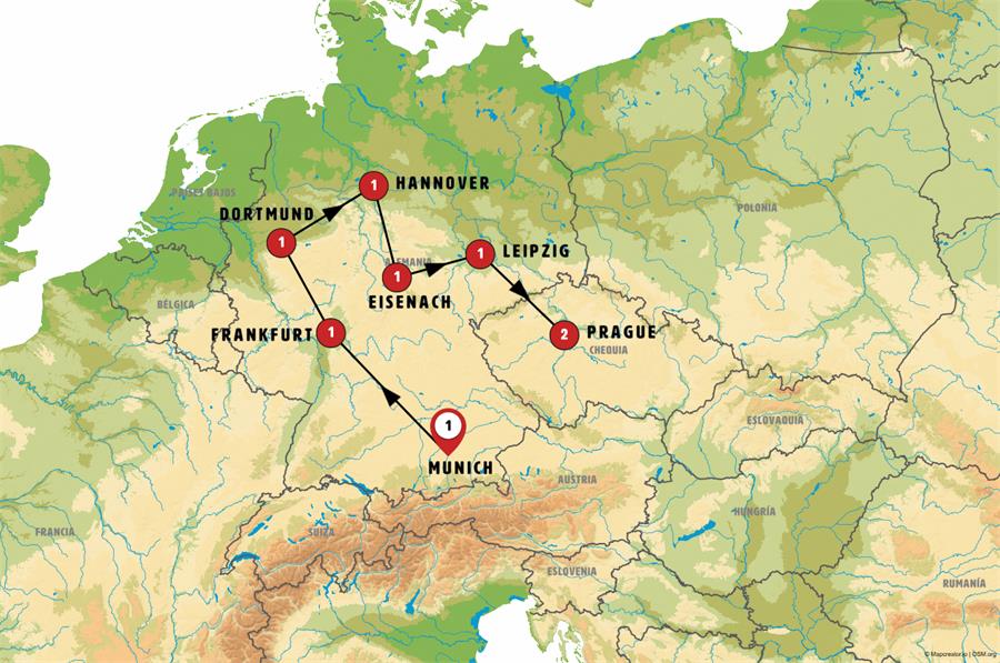 Later, we’ll cross into the Czech Republic. Arriving in Prague by mid-afternoon, we’ll include a panoramic tour of this beautiful city, often regarded as one of the most enchanting in Europe. Highlights include Prague Castle, the Old Town Square, and the stunning Charles Bridge. At the end of the day, the welcoming city center awaits you, home to traditional breweries where you can savor a wide variety of typical beers.