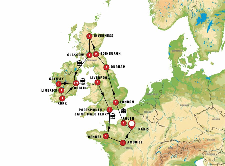 Today we’ll leave Glasgow and head towards southern Scotland to board a ferry in Cairnryan. Our journey will take us to Northern Ireland, arriving in Belfast, the capital of Northern Ireland, a monumental city that is emerging from its historical religious conflicts. We’ll then continue into Eire, Ireland, with our final stop in Dublin, arriving by the end of the day.