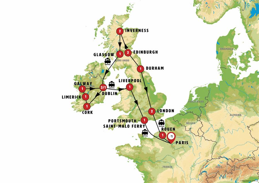 Today we’ll leave Glasgow and head towards southern Scotland to board a ferry in Cairnryan. Our journey will take us to Northern Ireland, arriving in Belfast, the capital of Northern Ireland, a monumental city that is emerging from its historical religious conflicts. We’ll then continue into Eire, Ireland, with our final stop in Dublin, arriving by the end of the day.