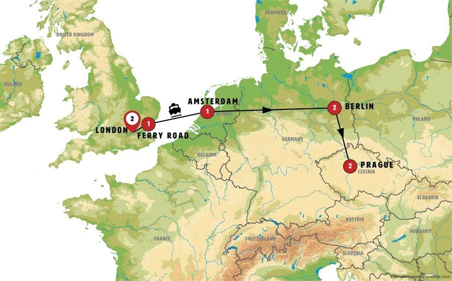 Important note: Due to the limited number of cabins available on the ferry, the itinerary may be adjusted. We might travel from London to Amsterdam via a daytime ferry, with an overnight stay in Antwerp, or alternatively, take a train or flight to Amsterdam.