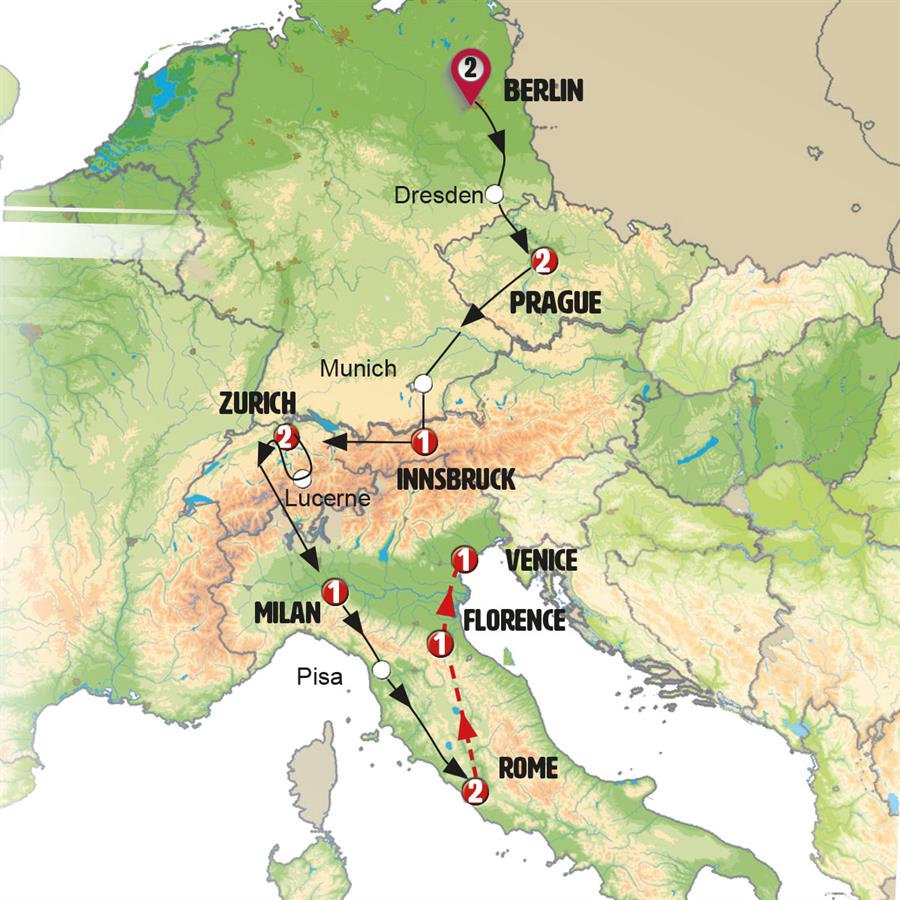Immerse yourself in the local culture with a tour of BERLIN, the incredible capital of GERMANY, accompanied by a local guide. From our coach, you´ll have the chance to see the Museum Island, the Television Tower, the city center’s main shopping streets, the old cathedral destroyed during World War II, the Brandenburg Gate, the Reichstag, and the city’s expansive parks. We’ll stop to visit the Holocaust Memorial and the Berlin Wall Memorial Museum—two powerful landmarks that remind us of Germany’s challenging history in the previous century. You’ll have the afternoon free to explore the city at your own pace. In the early evening, we’ll provide a transfer to the lively Kantstrasse area.