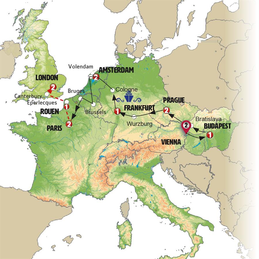 We’ll depart early from PRAGUE and stop in PILSEN, in western Bohemia, a city renowned for its beer. You’ll have time to stroll through its historic center, where you’ll find the Old Town Square, the cathedral, the Plague Column, and a Renaissance-era town hall. We’ll then cross into GERMANY and follow part of the Romantic Road. We’ll visit ROTHENBURG, a town that seems to come straight out of a fairy tale and is considered one of the most beautiful villages in the country. Afterward, we’ll head to FRANKFURT, the financial capital of Germany. After our arrival in the evening, enjoy free time in the historic city center, where you’ll find a wide variety of restaurants offering Indian, Asian, Italian, and international cuisines.