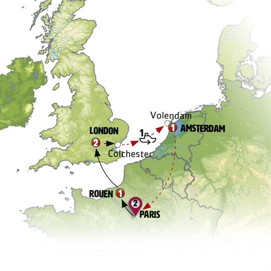 Important note: Due to the limited number of cabins available on the ferry, the itinerary may be adjusted. We might travel from London to Amsterdam via a daytime ferry, with an overnight stay in Antwerp, or alternatively, take a train or flight to Amsterdam.