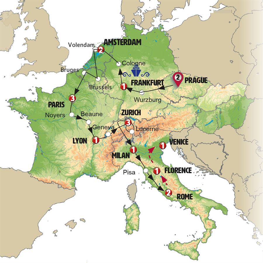 We’ll depart early from PRAGUE and stop in PILSEN, in western Bohemia, a city renowned for its beer. You’ll have time to stroll through its historic center, where you’ll find the Old Town Square, the cathedral, the Plague Column, and a Renaissance-era town hall. We’ll then cross into GERMANY and follow part of the Romantic Road. We’ll visit ROTHENBURG, a town that seems to come straight out of a fairy tale and is considered one of the most beautiful villages in the country. Afterward, we’ll head to FRANKFURT, the financial capital of Germany. After our arrival in the evening, enjoy free time in the historic city center, where you’ll find a wide variety of restaurants offering Indian, Asian, Italian, and international cuisines.