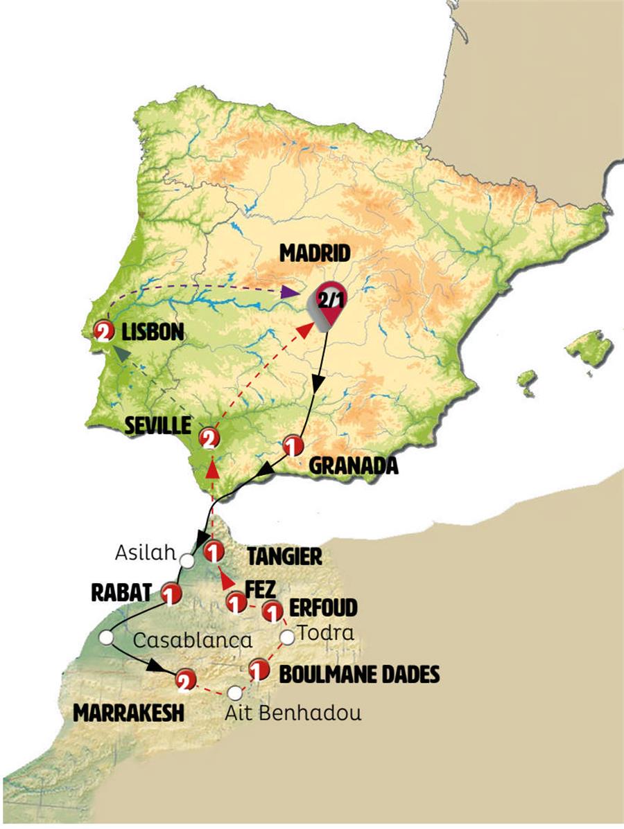 Today, we´ll explore one of the most fascinating places in the world, the city that gave Morocco its name. Our city tour will take us through its strong walls, the bustling Jemaa el-Fnaa square, the Medina, the Koutoubia Mosque, and the Bahia Palace (tickets included). Afterward, you´ll have free time for lunch (included) and to relax by the pool or in the hotel garden, or to shop in the souks. In the evening, you can join the Fantasy Party, an optional excursion offered by Europamundo.