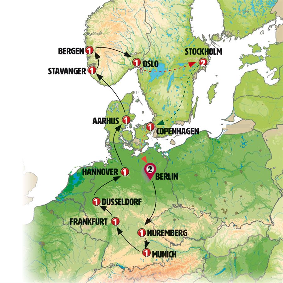 We’ll travel to HIRTSHALS and take a ferry across the North Sea to NORWAY, embarking on a three-hour voyage to KRISTIANSAND. From there, we’ll continue along Norway’s stunning southern coastline. Our next stop will be the charming little town of FLEKKEFJORD. We’ll then arrive in STAVANGER, a picturesque town with a bustling port by the fjord.
