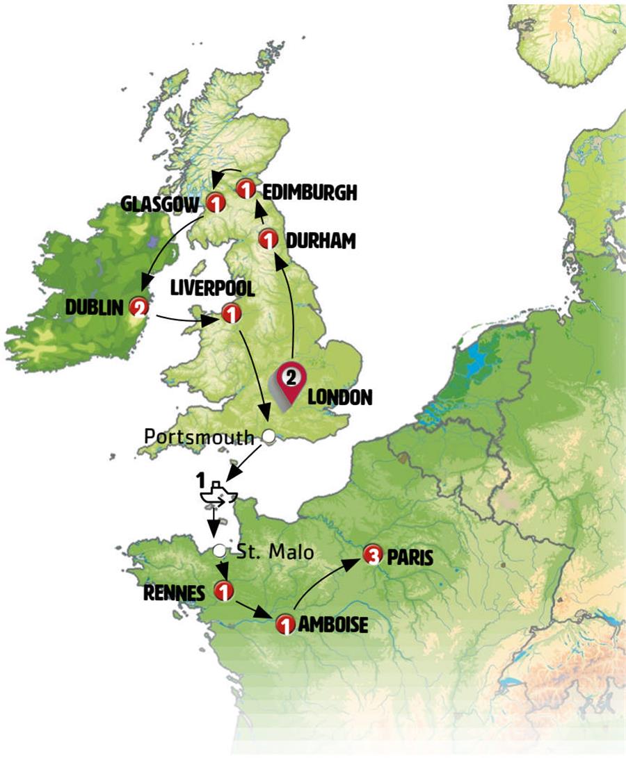 Today we’ll leave Glasgow and head towards southern Scotland to board a ferry in Cairnryan. Our journey will take us to Northern Ireland, arriving in Belfast, the capital of Northern Ireland, a monumental city that is emerging from its historical religious conflicts. We’ll then continue into Eire, Ireland, with our final stop in Dublin, arriving by the end of the day.