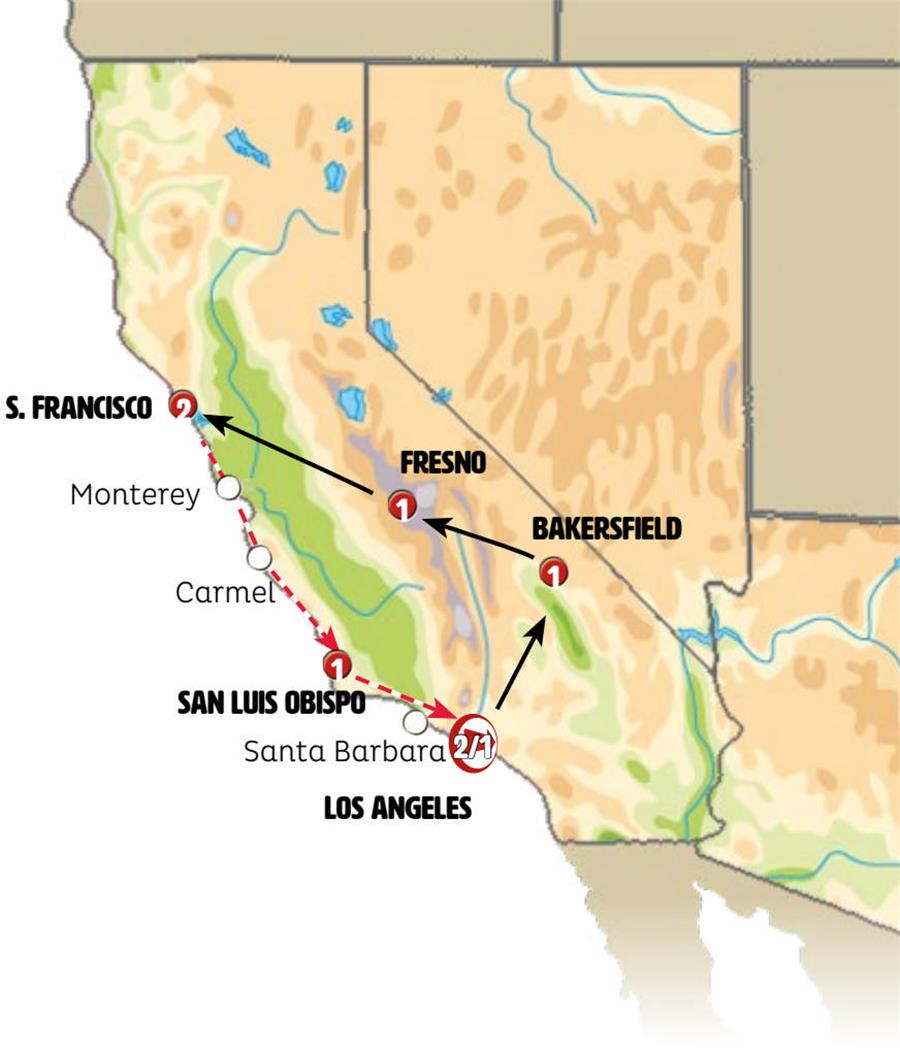TODAY’S HIGHLIGHTS: Amazing forests with its sequoias. After breakfast, we set out on a journey with scenery that is completely unlike what we saw the day before. We leave the desert behind us and enter one of the most impressive forests in the USA, inhabited by an exception species: Giant Sequoias. Visit to the Sequoia National Park. Visitors can take pictures of the General Sherman, the largest tree in the world, among others, and stroll amidst these giants of nature. Then we continue to Fresno.