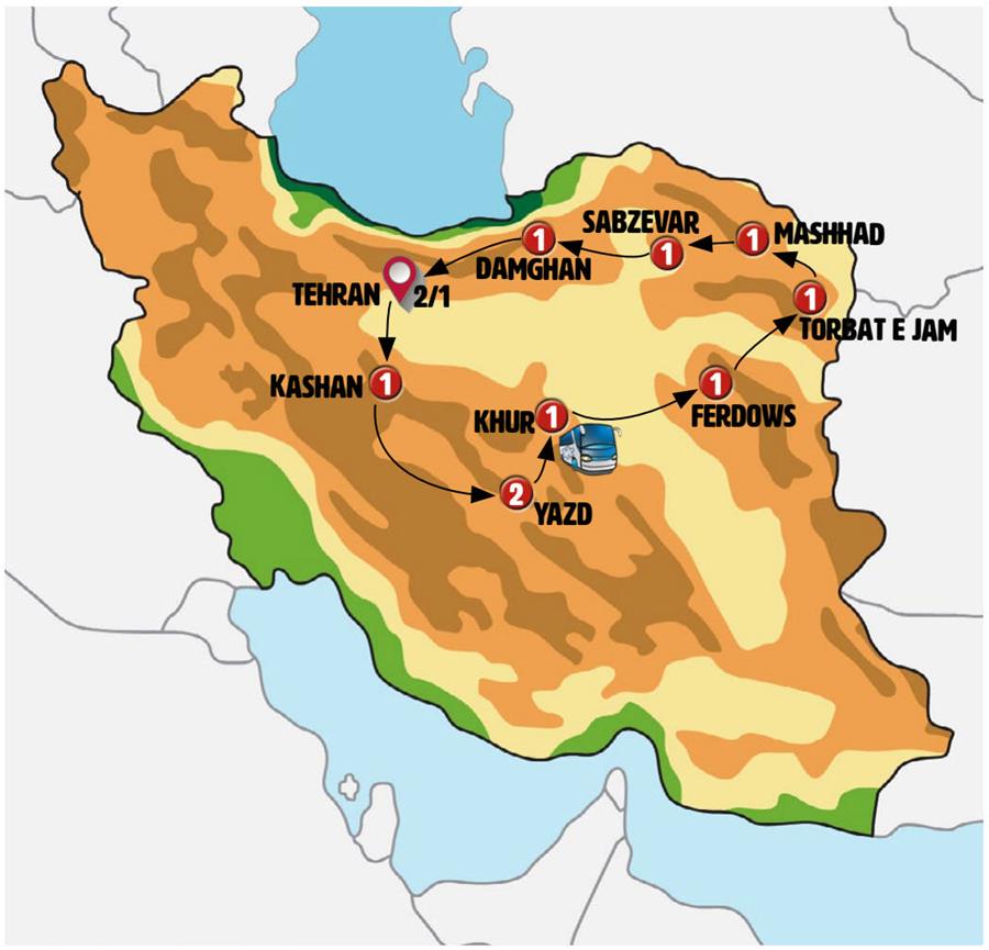 We will depart from Khur to the east of the country; we will cross the "dry salt lake" with its colors and polygonal crystal formations. We will make a stop in TABAS, known as "the bride of the desert", a pleasant city where we will visit the Golshan Garden. Afterwards, we will stop at the Historic Village of ESFAHAK, an oasis city that was destroyed by an earthquake in 1978, rebuilt as an adobe city and hiding many places of great charm. Lunch included.