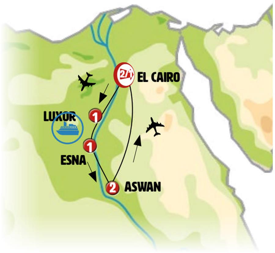 Breakfast. Transfer to the airport to take the plane to Cairo (flight included). Arrival to CAIRO airport and transfer to the hotel. During the evening, visit the Light and Sound Show at the Giza Pyramids. Accommodation.