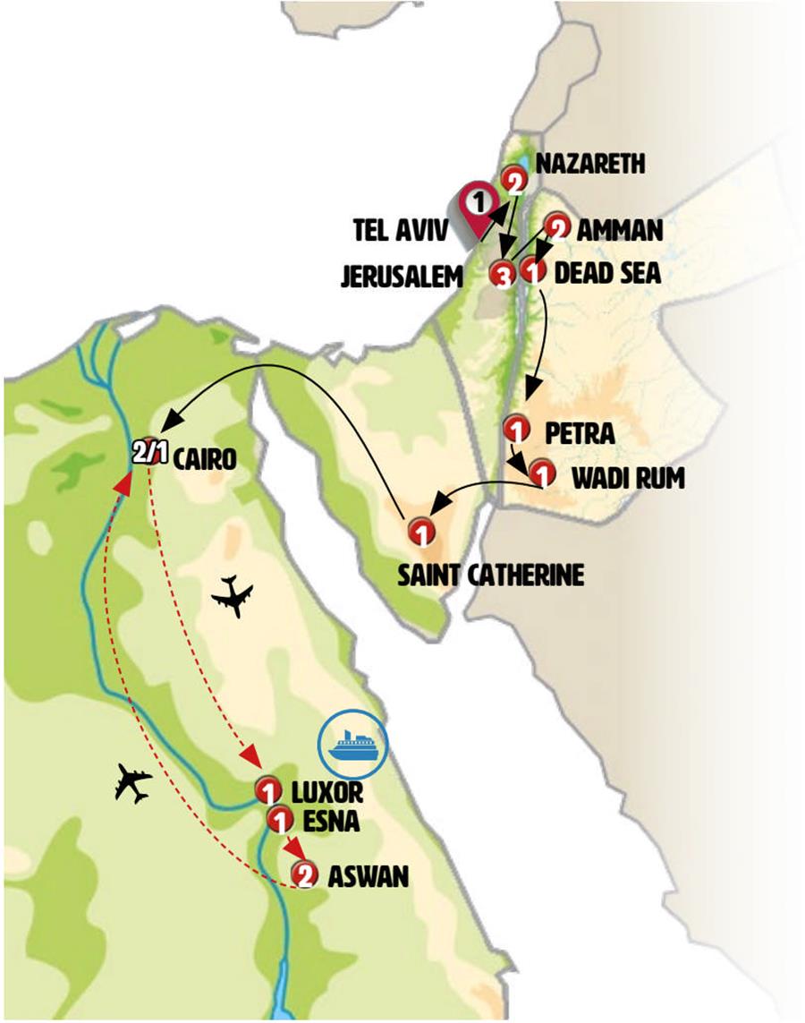 IMPORTANT NOTE: Due to exceptional circumstances or due to a small number of participants, it may happen that we will cross directly from Jordan to Egypt by boat, taking the AQABA- TABA FERRY with a duration of just over two hours. During the ferry crossing, there will be no assistance from any guide.