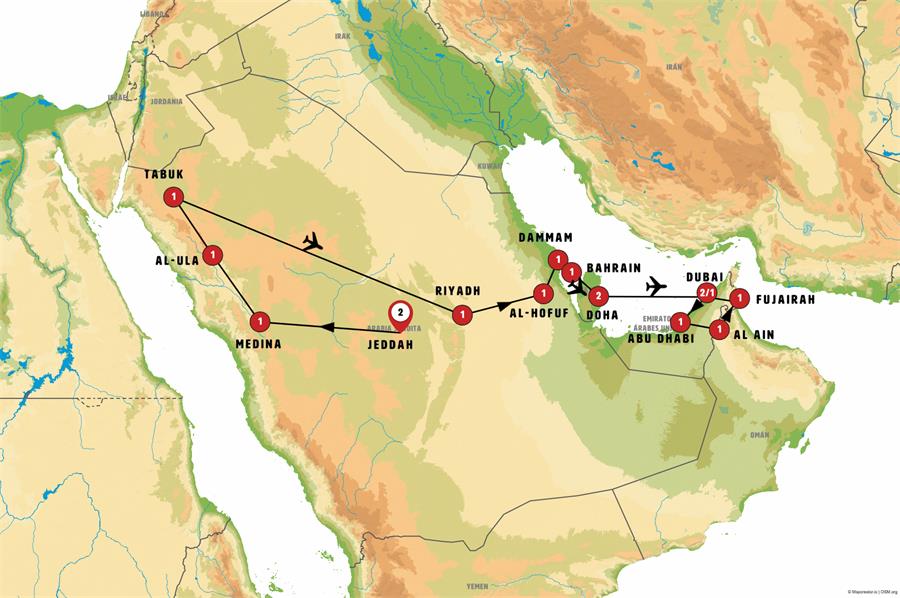 After breakfast we cross the 25-kilometer Friendship Bridge, which connects Arabia with Bahrain. Border procedures. Bahrain is a small country of 765 sq. km inhabited by just under two million inhabitants that has always had great historical importance. MANAMA, arrival in the capital of the country. We include the tour of this small country. We will visit the historic neighborhood of Muharraq, where, in its pedestrian alleys, there are some of the most beautiful historical buildings in the country, such as royal residences and well-restored houses of rich pearl merchants. With our bus we will go around the corniche and include the admission to Beit Al Quran, the museum dedicated to the Koran, the holy book of Muslims. We also visit the fantastic National Museum of Bahrain, which allows us to delve into the art, ethnography and traditions of this country and understand the importance it had throughout history. Time at the mall, so you can have lunch at their food court according to your preferences.