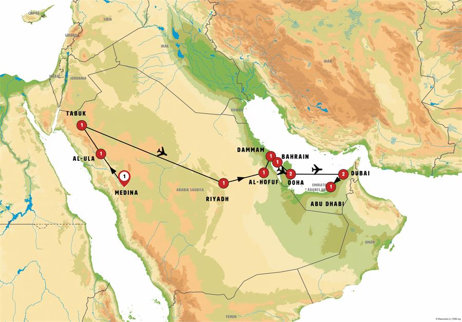 After breakfast we cross the 25-kilometer Friendship Bridge, which connects Arabia with Bahrain. Border procedures. Bahrain is a small country of 765 sq. km inhabited by just under two million inhabitants that has always had great historical importance. MANAMA, arrival in the capital of the country. We include the tour of this small country. We will visit the historic neighborhood of Muharraq, where, in its pedestrian alleys, there are some of the most beautiful historical buildings in the country, such as royal residences and well-restored houses of rich pearl merchants. With our bus we will go around the corniche and include the admission to Beit Al Quran, the museum dedicated to the Koran, the holy book of Muslims. We also visit the fantastic National Museum of Bahrain, which allows us to delve into the art, ethnography and traditions of this country and understand the importance it had throughout history. Time at the mall, so you can have lunch at their food court according to your preferences.