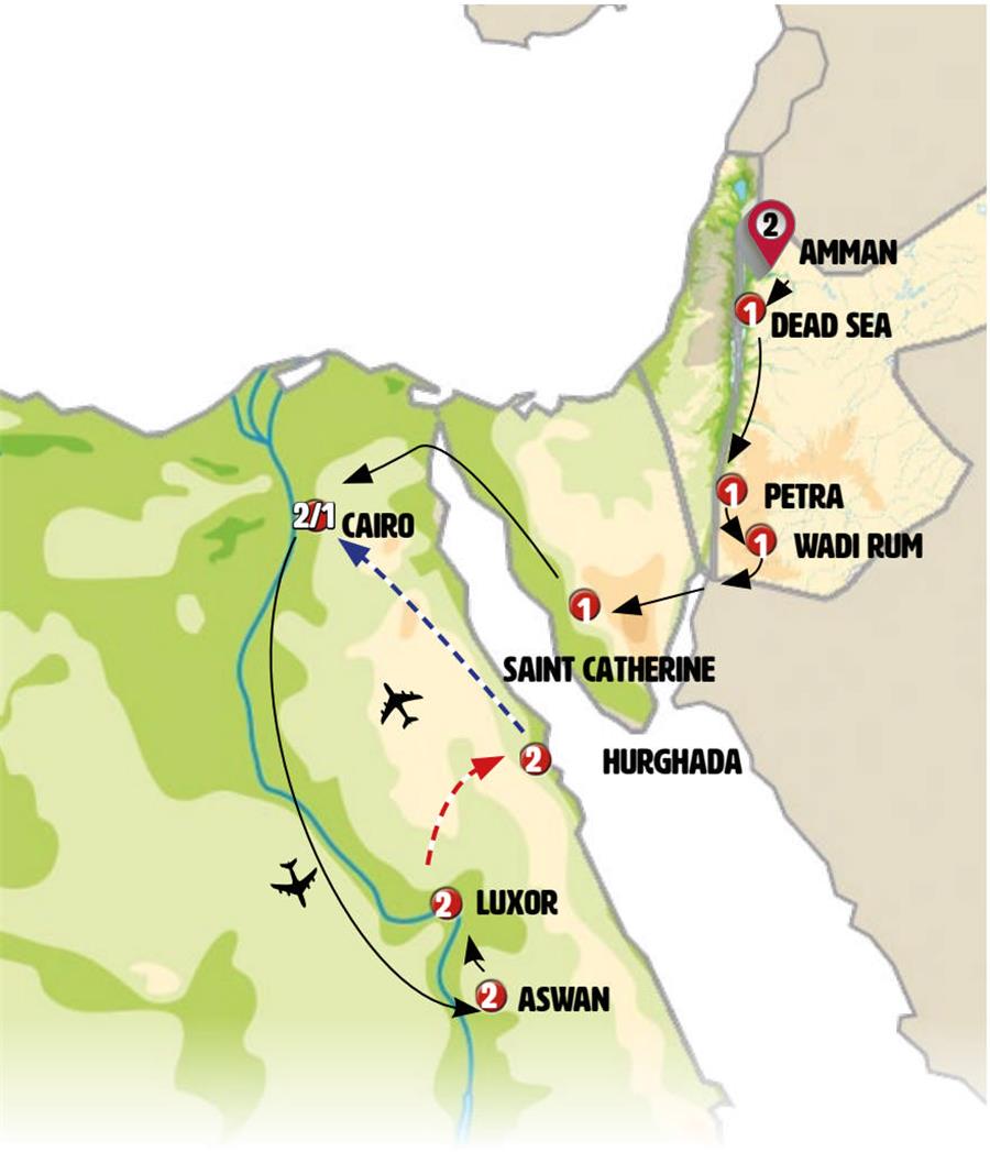 IMPORTANT NOTE: Due to exceptional circumstances or due to a small number of participants, it may happen that we will cross directly from Jordan to Egypt by boat, taking the AQABA- TABA FERRY with a duration of just over two hours. During the ferry crossing, there will be no assistance from any guide.