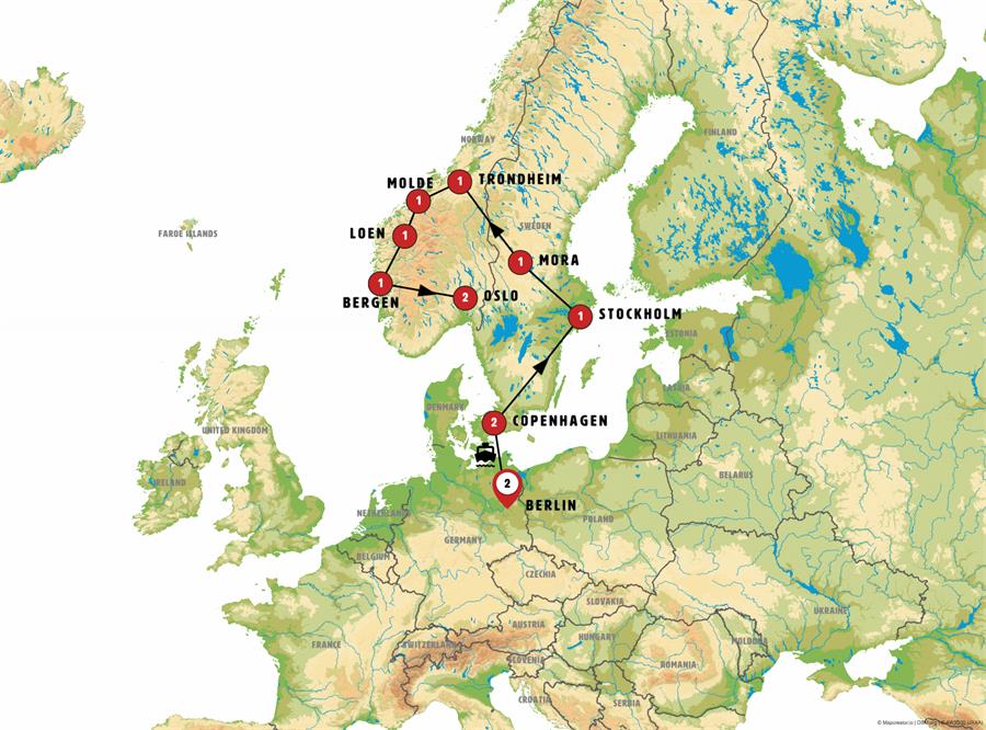 Enjoy some free time in BERLIN. At 11:30 a.m., we’ll depart from the German capital and head north. In Rostock, we’ll board a ferry, scheduled to depart at 03:30 p.m. The Baltic Sea crossing to DENMARK will take nearly two hours. Relish the cruise on this modern ship. Upon arrival in Denmark, we’ll travel through scenic landscapes, reaching COPENHAGEN by the end of the day.
