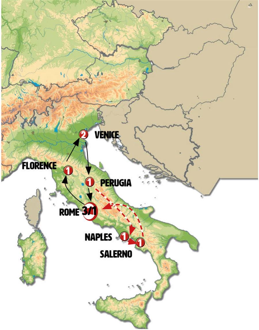We’ll leave FLORENCE early and head towards northern ITALY, crossing the Apennines. In VENICE, we’ll take a boat transfer to the city center for a walking tour of the San Marco district, where you’ll see the Basilica and the Campanile. We’ll also visit a Murano Glass Factory to admire traditional glass-working techniques. Accommodation will be in the Mestre area.
